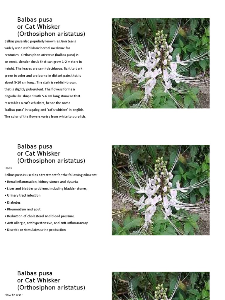 - wash fresh or dried balbas pusa or cats whisker leaves chop then add in 4 cups of water for every 1 cup let it boil for 10 to 15 minutes Let it steep then strain. Half a cup of Java tea can be taken thrice daily. Also to know is how do you use Balbas Pusa.
