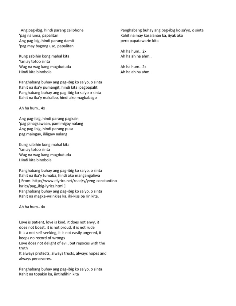 Ang pag-ibig hindi parang cellphone Kapag naluma papalitan Ang pag-ibig hindi parang damit Pag may bagong uso papalitan Kung sabihin kong mahal kita Yan ay totoo sinta Wag na wag kang magdududa Hindi kita binobola Panghabang buhay ang pag-ibig ko sayo o sinta Kahit na ikay pumangit hindi kita ipagpapalit Panghabang buhay ang pag-ibig ko sayo o sinta Kahit na ikay. Mga salitang hiram na may apat na pantig. Ang pinapayo parin ng mga awtoridad ay magpaturok para sigurado.